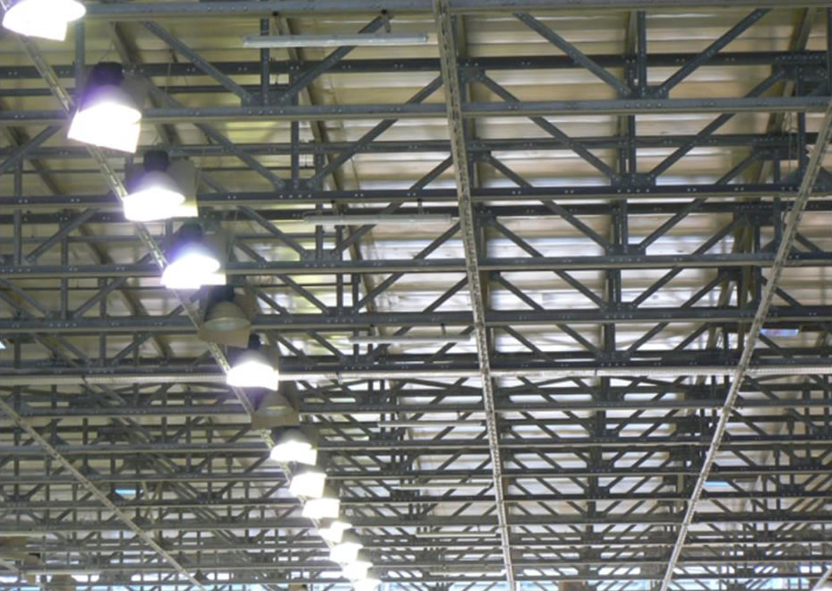 La caratteristica strutturale dominante, per la parte in acciaio, è costituita dalle tre imponenti reticolari reggi capriata poste sopra i portoni di accesso all’hangar. Le luci variano dai 25 ai 33 metri con intradosso dai 7 ai 12 metri. Ciascuna sostiene un sistema di capriate da 28 metri di luce e 4,15 metri di passo.